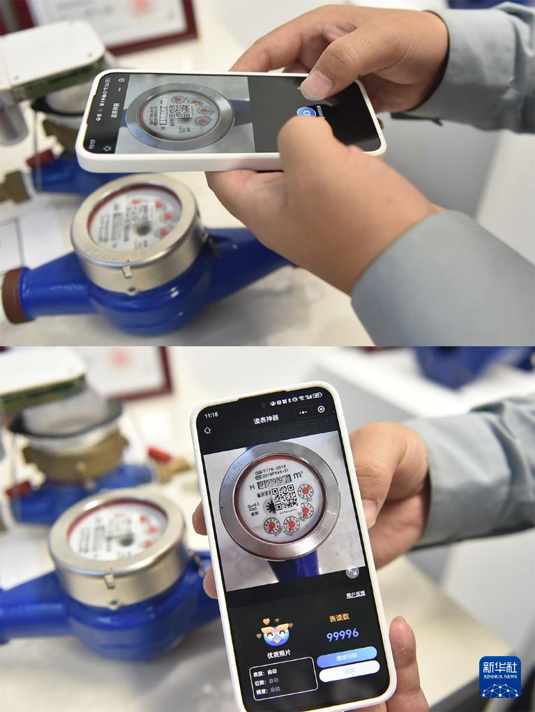 这是一张拼版照片。上图:在北京三合智能科技有限公司,谷鹄翔用“读表神器”微信小程序扫描贴在家用水表上的二维码(5月21日摄);下图:谷鹄翔展示“读表神器”微信小程序在手机端最终显示的读表结果,包括仪表的整数位读数识别结果和拍照质量评估(5月21日摄)。