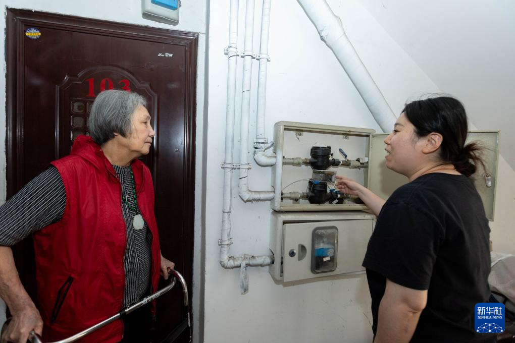 5月28日,在上海市长宁区江苏路街道岐山村居民区,岐山居委会工作人员向老人介绍加装了智能相机的水表。老人家中水表加装了谷鹄翔团队自主研发的智能相机,可通过传输到后台的数据,了解用水情况。