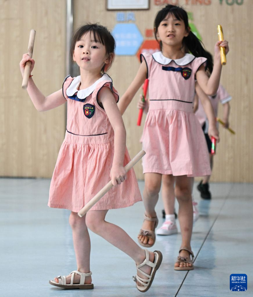 5月29日,在汕头市贵屿镇北林保婴幼儿园,庄恩琪(前左)在练习跳英歌舞。 新华社记者 邓华 摄pagebreak