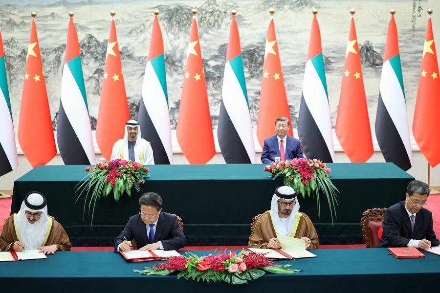 5月30日下午,国家主席习近平在北京人民大会堂同来华国事访问并出席中国-阿拉伯国家合作论坛第十届部长级会议开幕式的阿联酋总统穆罕默德举行会谈。这是会谈后,两国元首共同见证签署多项双边合作文件。