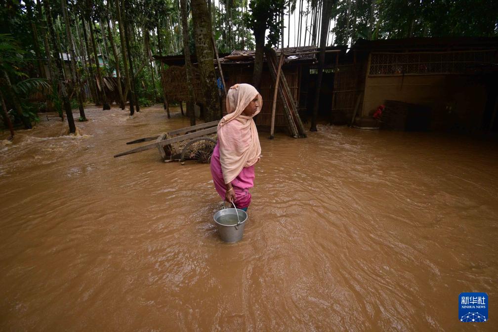5月29日,在印度东北部阿萨姆邦,一名女子提着水桶走在洪水中。