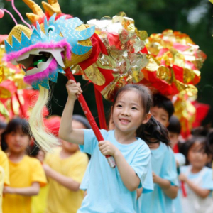 5月30日,浙江省温岭市中心幼儿园的小朋友在舞龙。