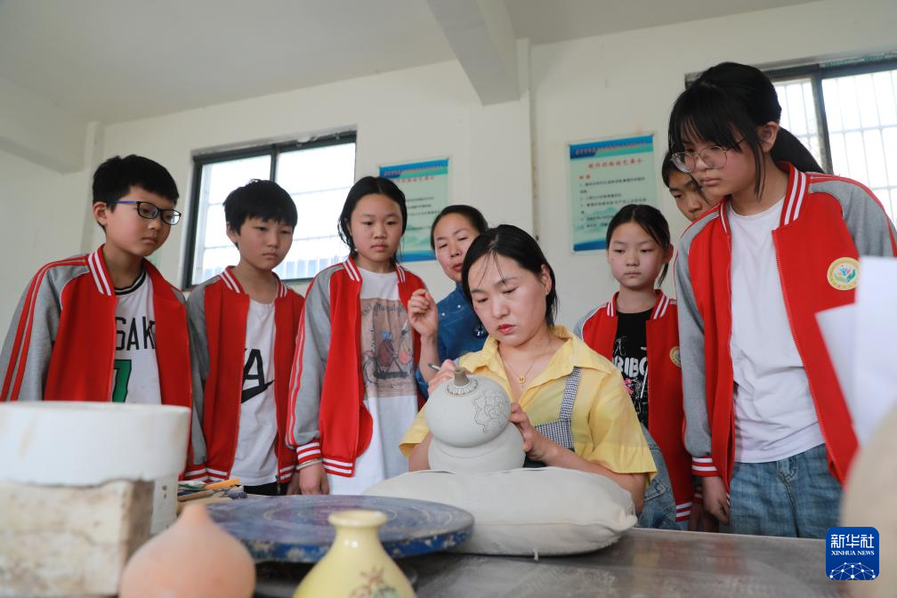 5月29日,在位于界首市田营镇韩楼村的彩陶博物馆,界首彩陶烧制技艺省级非遗传承人邢淑芹(左二)指导学生们进行彩陶刻画。