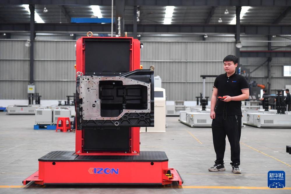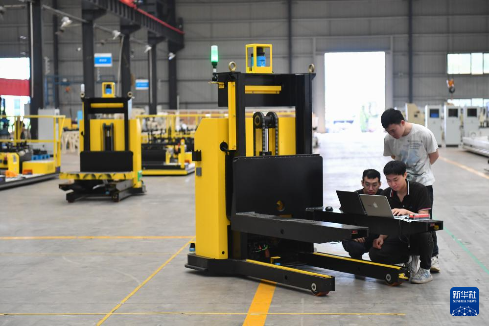 5月31日,在长沙雨花经济开发区的机器人产业集聚区,一家机器人企业的工作人员在调试重载叉举型机器人。