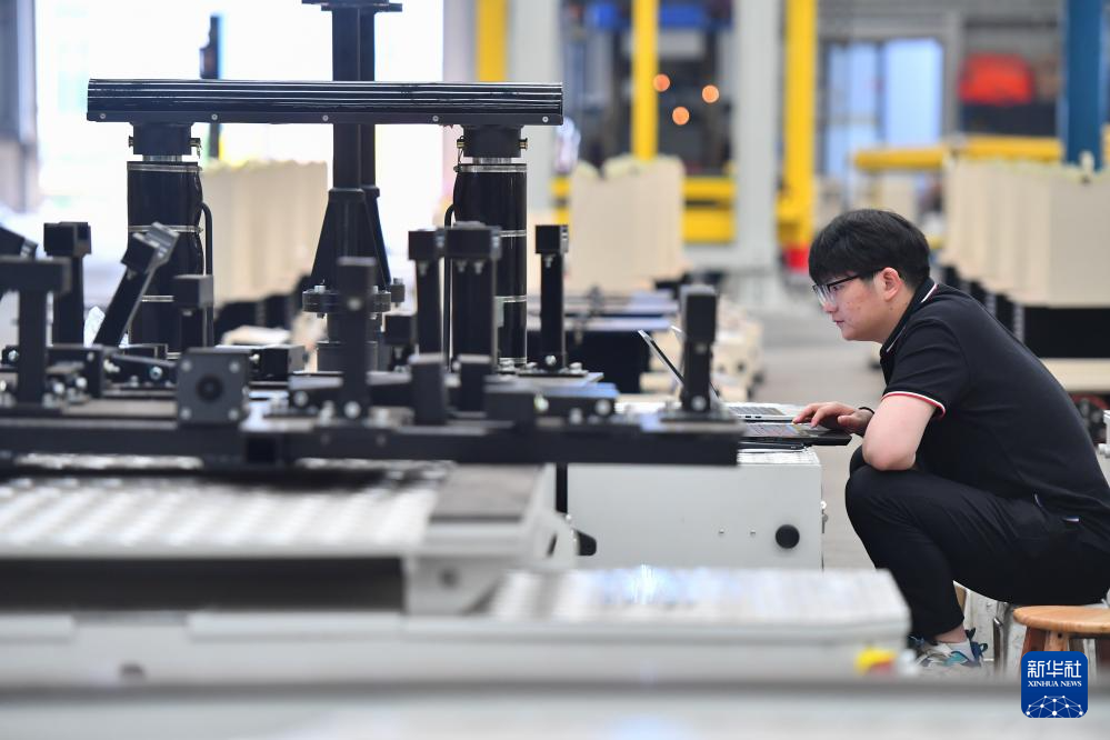 5月31日,在长沙雨花经济开发区的机器人产业集聚区,一家机器人企业的工作人员在调试装配举升型机器人。