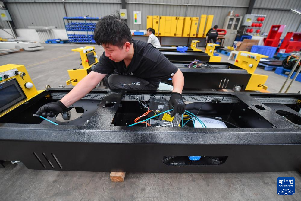 5月31日,在长沙雨花经济开发区的机器人产业集聚区,一家机器人企业的工作人员在查看潜入牵引型机器人线束。