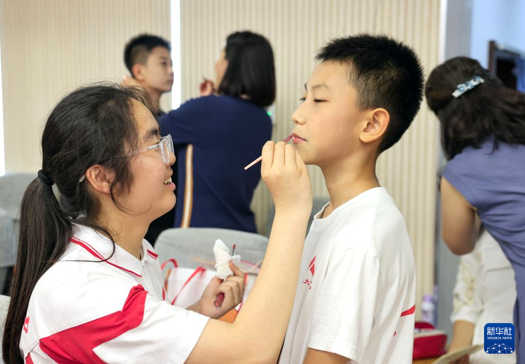 5月23日,中国人民大学附属中学分校初中部的学生在戏剧节表演前化妆。