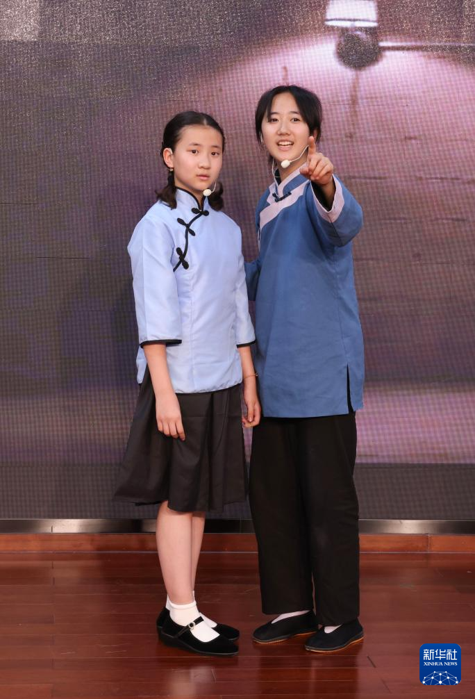 5月31日,中国人民大学附属中学分校高中部的学生指导小学部学生进行戏剧表演。