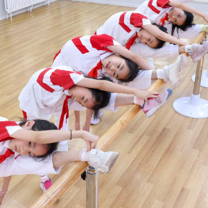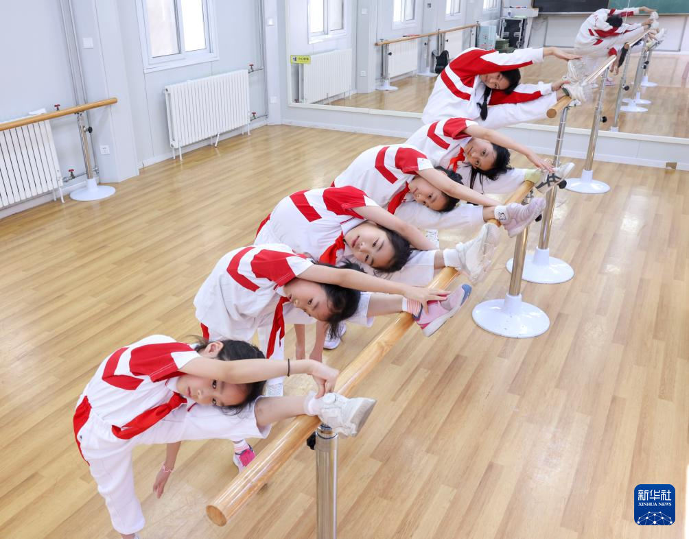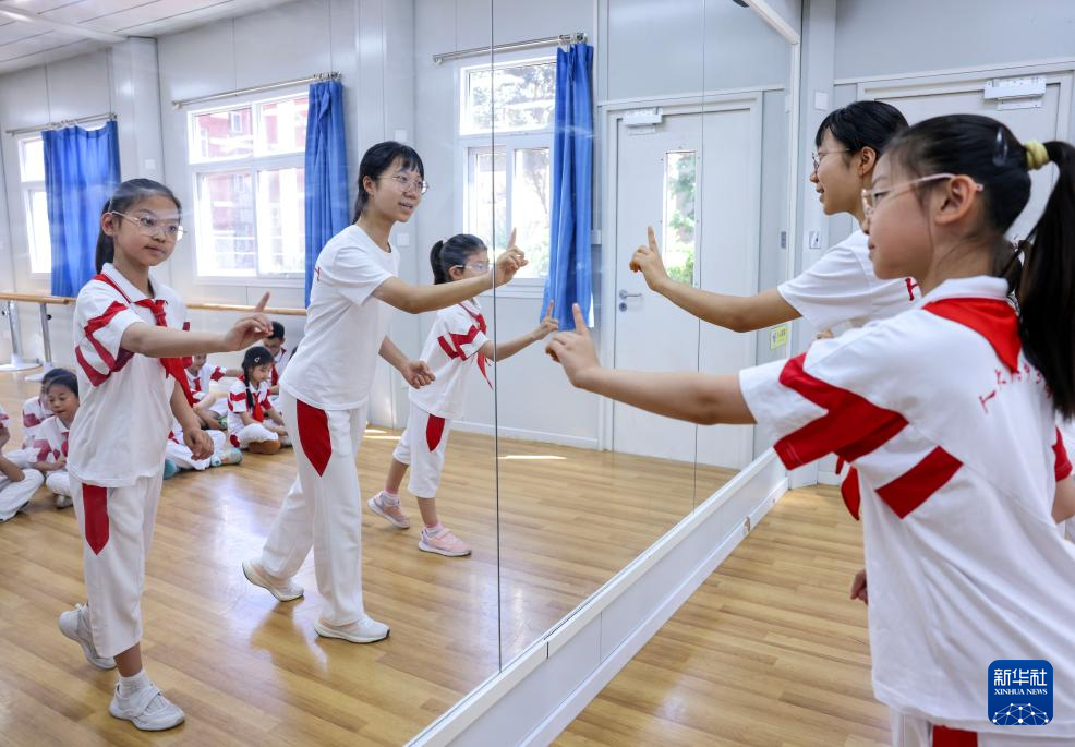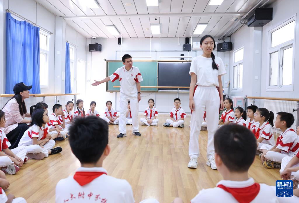 5月31日,中国人民大学附属中学分校高中部的学生(后)带领小学部学生进行基本功训练。