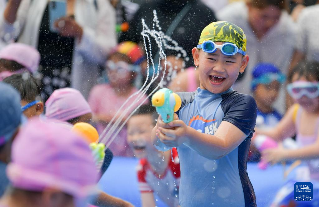 5月31日,贵州省印江土家族苗族自治县第二幼儿园的孩子们在泡泡派对上玩耍戏水。