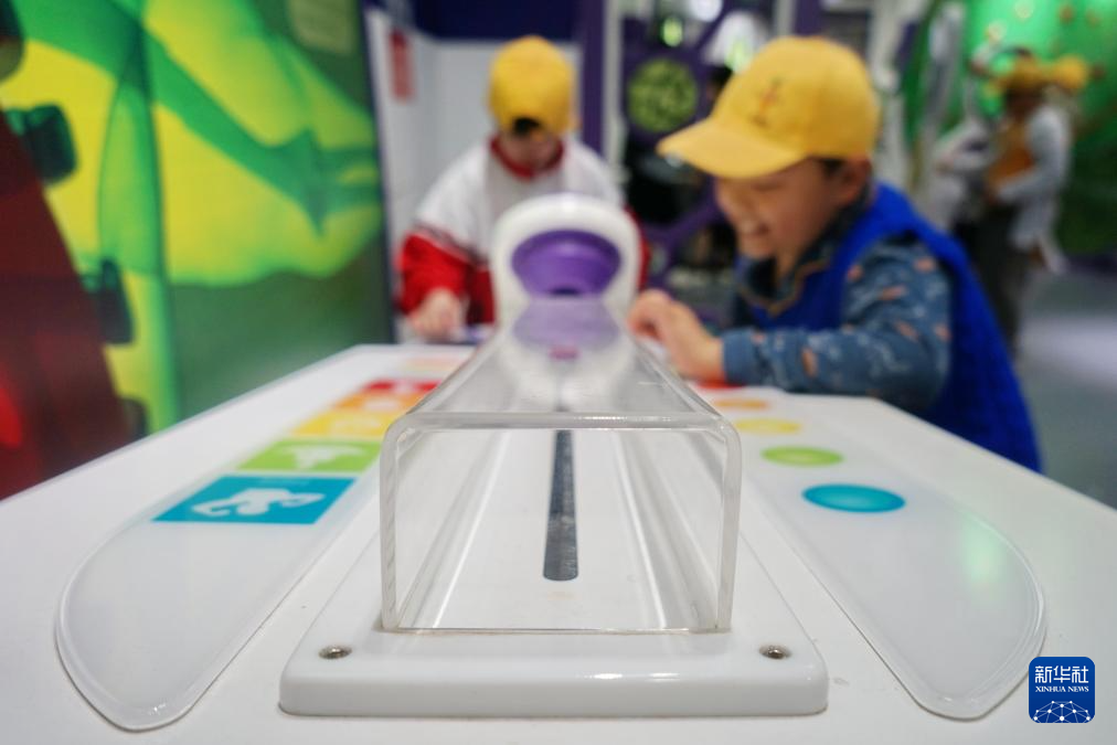 5月31日,小朋友在河北省石家庄市科技馆体验项目。