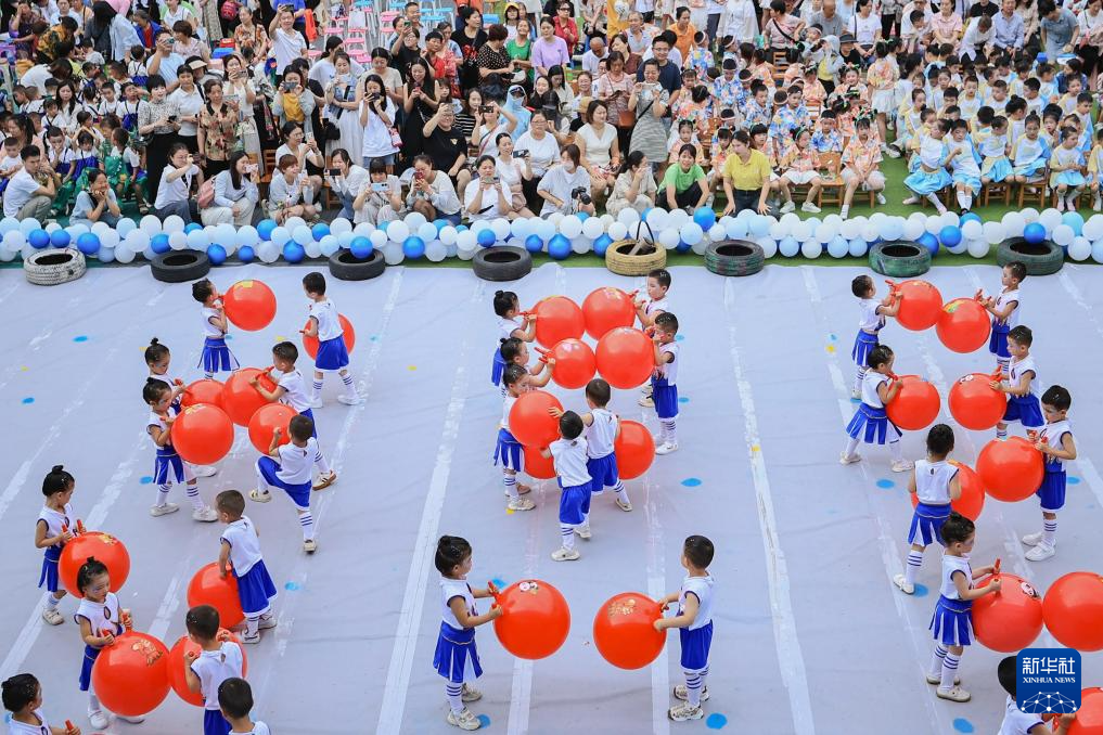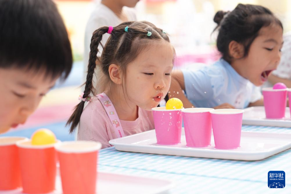5月31日,在重庆市北碚区将军路幼儿园,孩子们参加吹乒乓球趣味游戏。