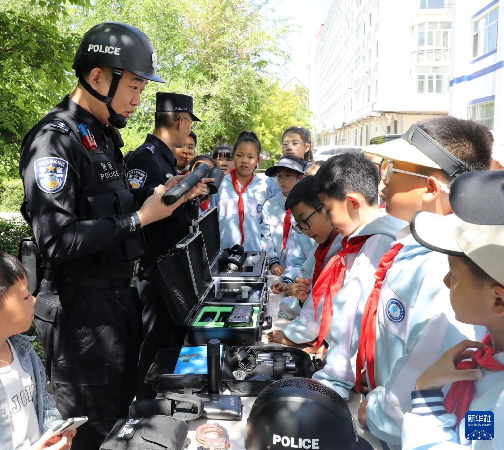 5月31日,在黑龙江出入境边防检查总站黑河边境管理支队大黑河岛边境派出所警营开放日活动中,民警为学生们讲解警用装备。