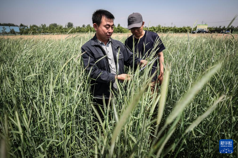 5月30日,吕林有(左)与工作人员在辽宁省农业科学院沙地治理与利用研究所章古台基地查看牧草生长情况。