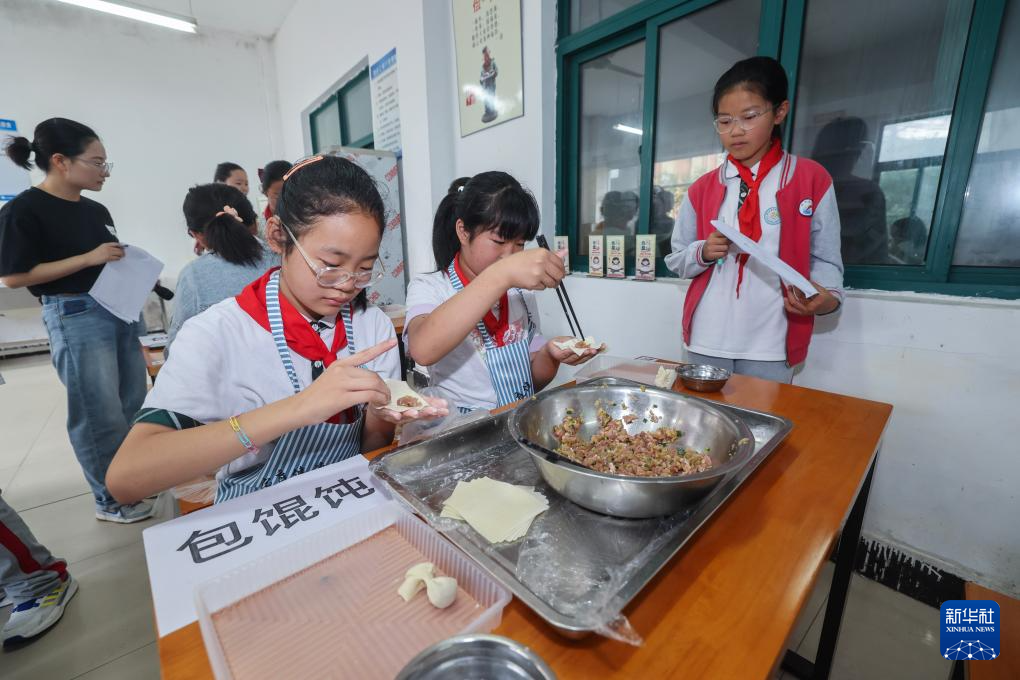 5月31日,在湖州市织里镇漾西学校组织的劳动技能大比拼上,孩子们在参加包馄饨比赛。
