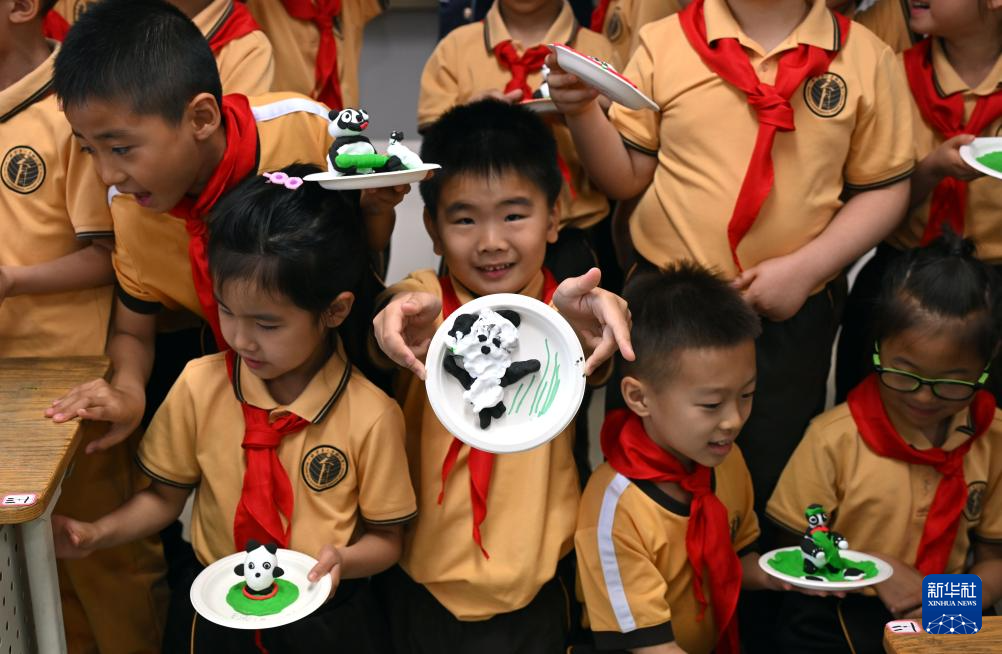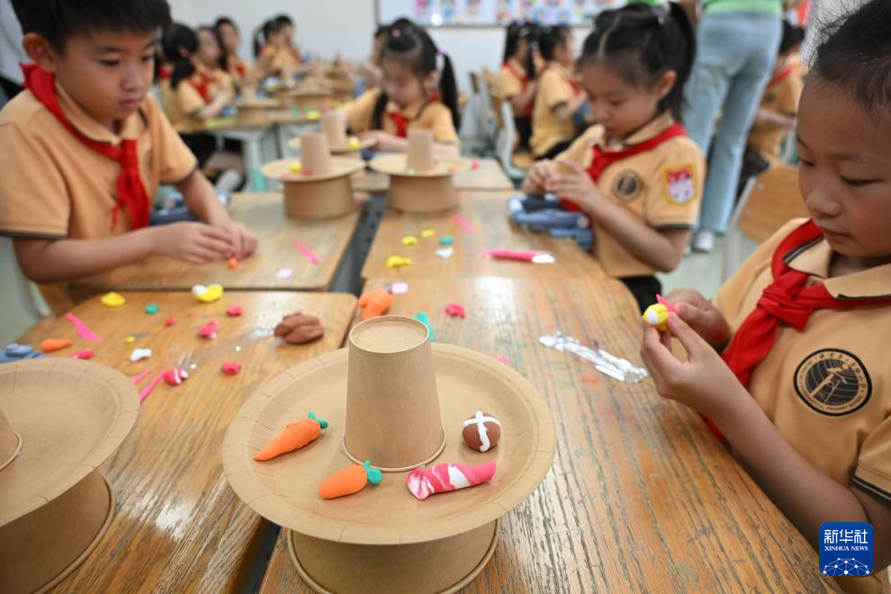 5月31日,小学生展示自己制作的“粘土面塑”作品。