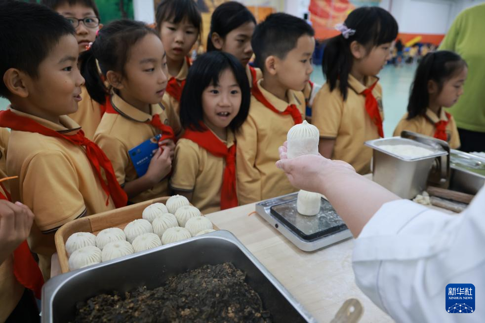 5月31日,来今雨轩的面点师傅为学生们展示冬菜包子的做法。