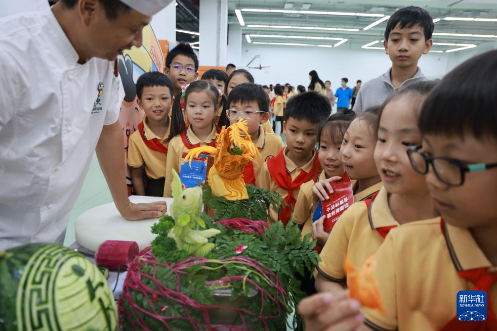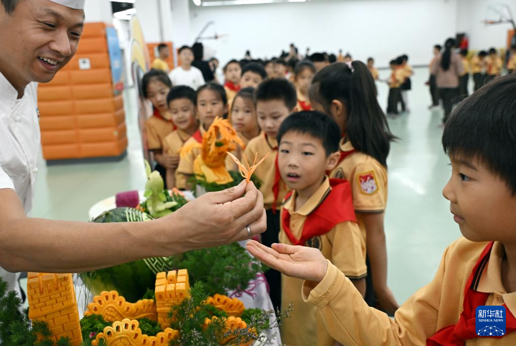 5月31日,东来顺的雕工师傅为学生们展示用瓜果雕刻的造型。