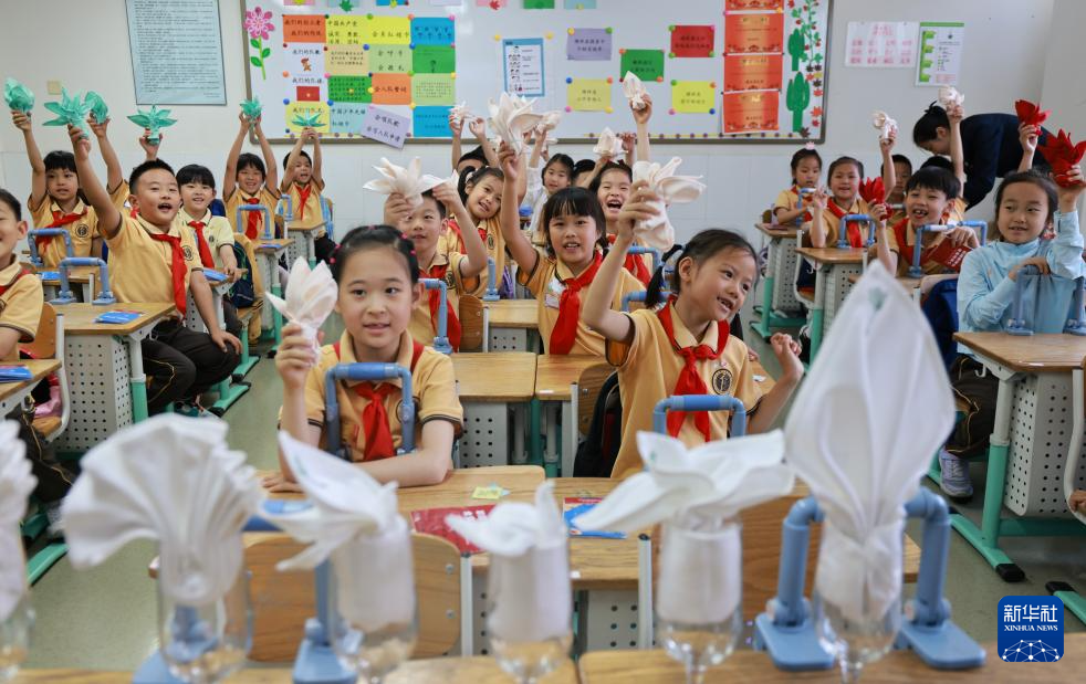 5月31日,在北京市外事学校老师的指导下,同学们展示自己叠好的口布造型。