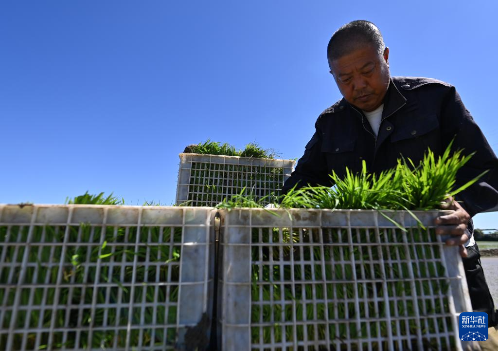 5月31日,种植工人在整理水稻秧苗。