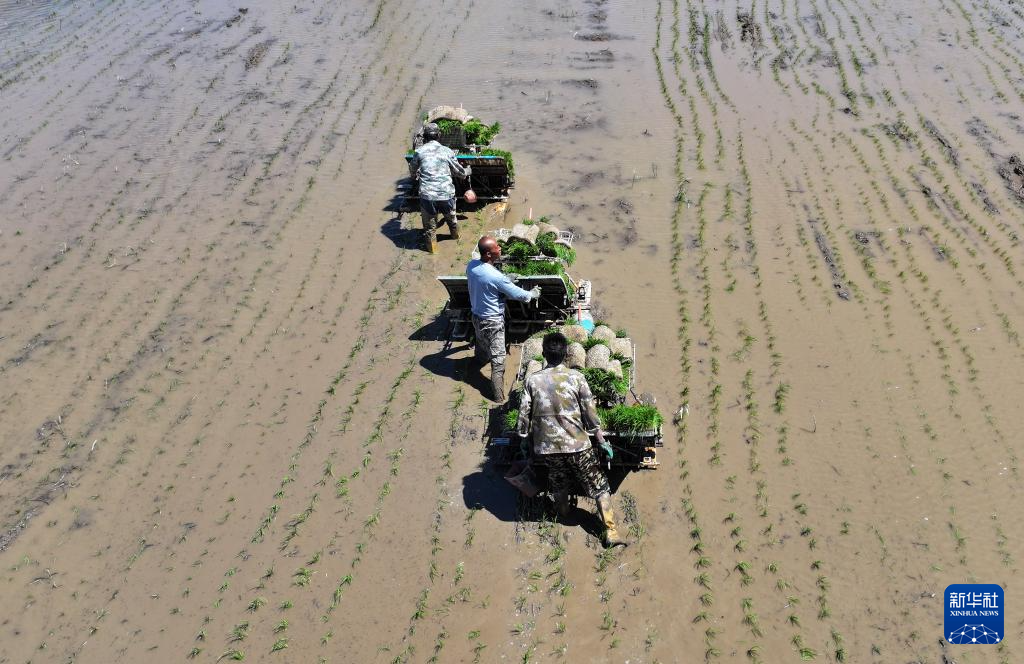 5月31日,种植工人在进行水稻插秧工作(无人机照片)。