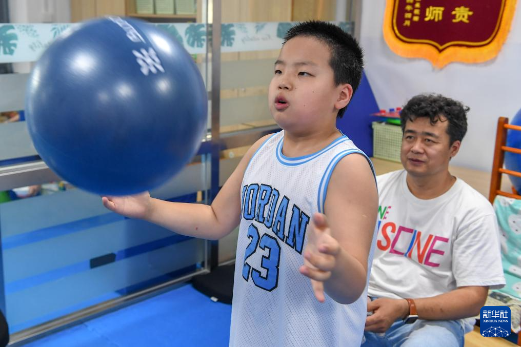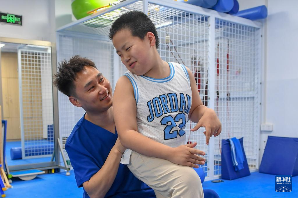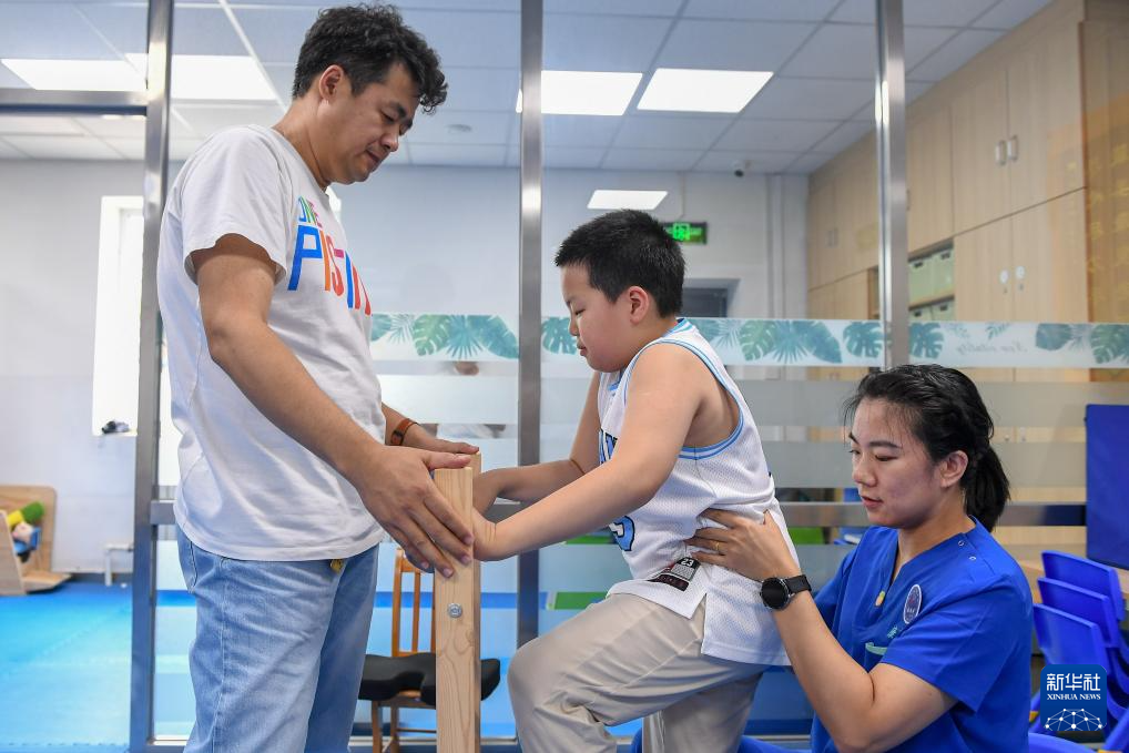 5月30日,在吉林延安医院,爱马在父亲的帮助下进行康复训练。