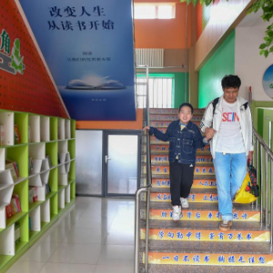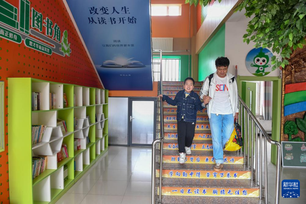 5月30日,在长春净月潭实验小学,父亲扶着爱马下楼。