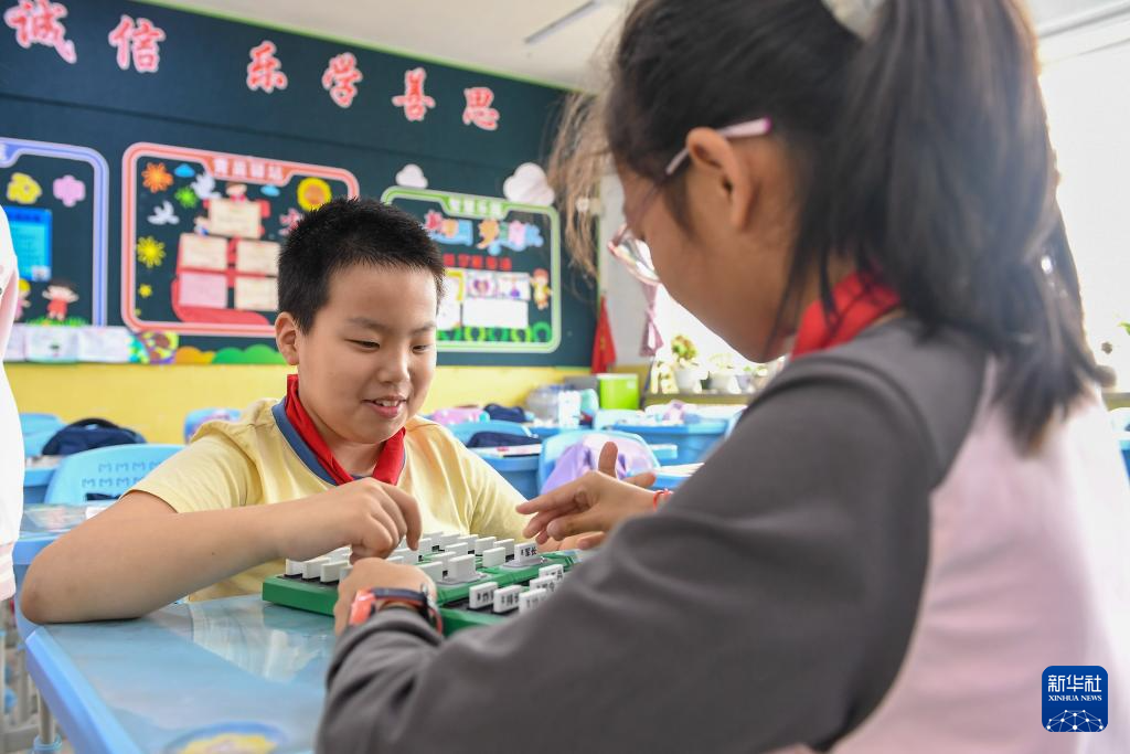 5月30日,在长春净月潭实验小学,爱马(左)与同学下棋。