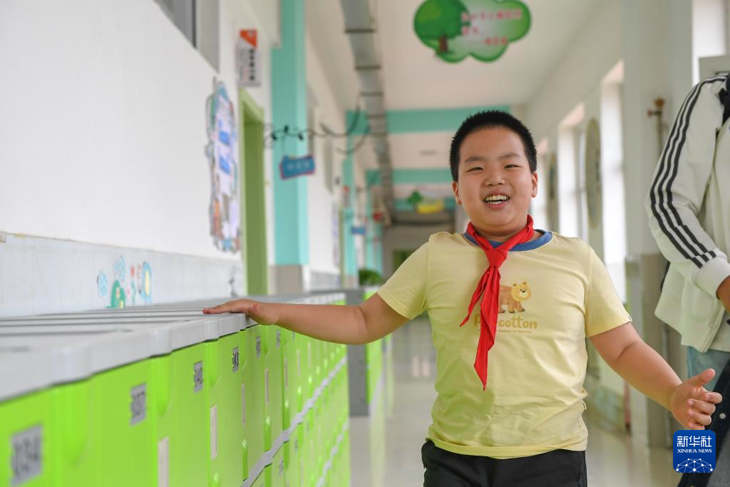 5月30日,在长春净月潭实验小学,爱马扶着柜子行走。