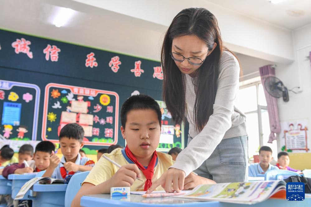 5月30日,在长春净月潭实验小学,教师马爽(右)辅导爱马学习。