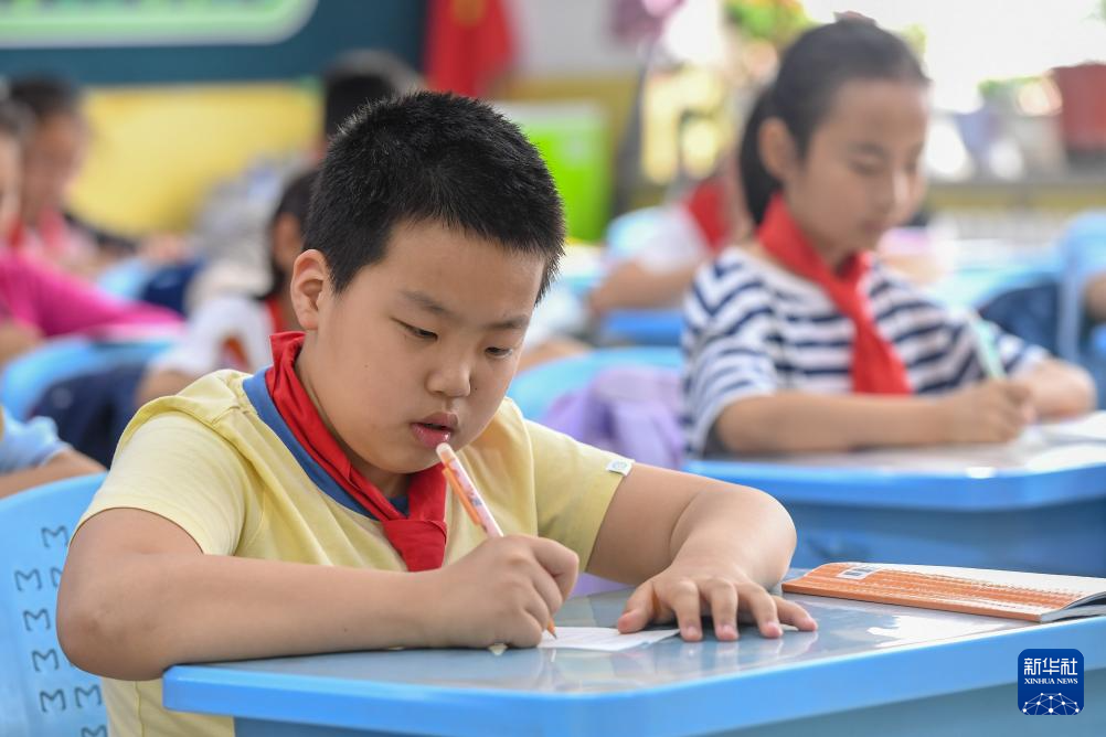 5月30日,在长春净月潭实验小学,爱马在课堂上学习。