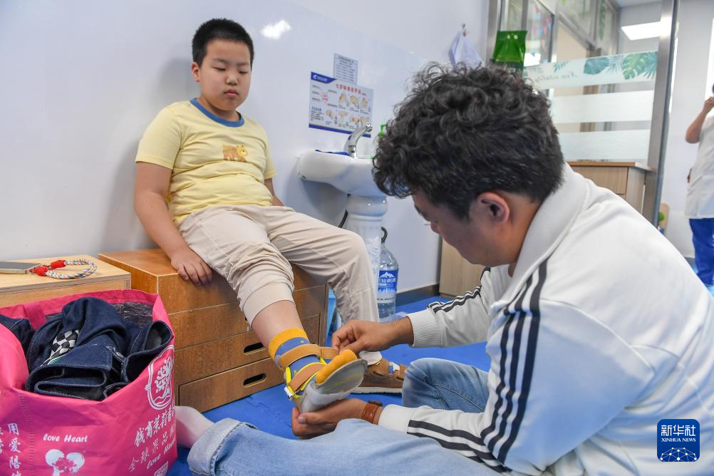 5月30日,在吉林延安医院,父亲为爱马穿上康复训练用的矫形器。