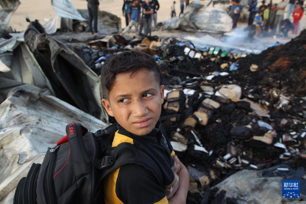 5月27日,一名男孩在加沙地带南部城市拉法查看以军轰炸后的难民营废墟。