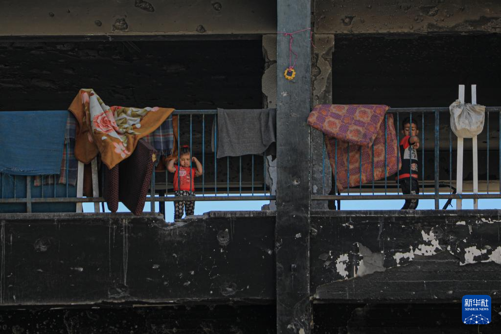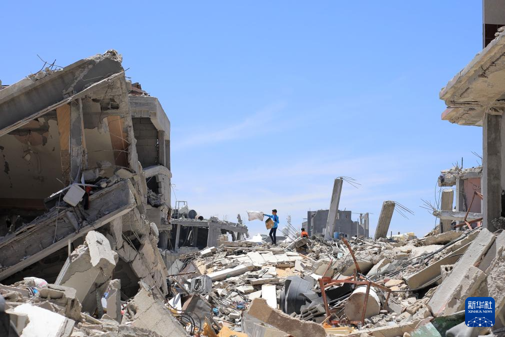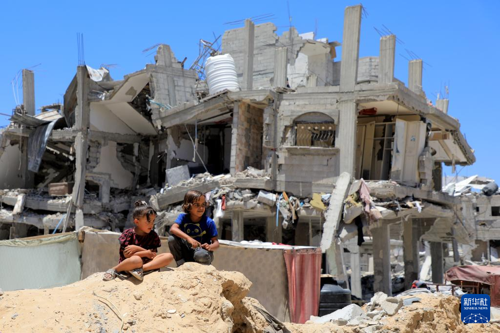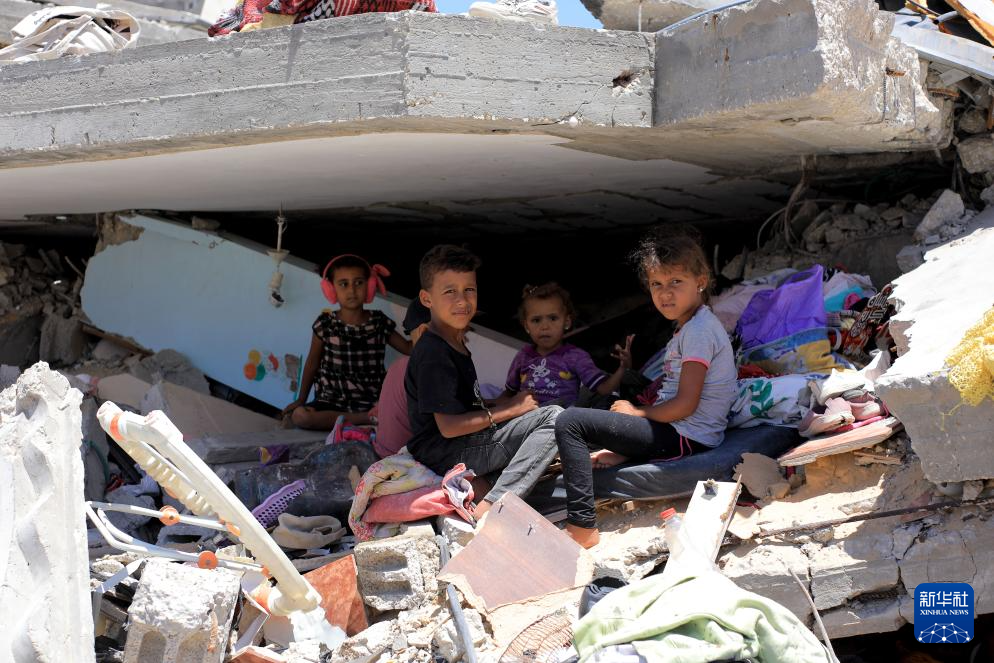 这是5月31日在加沙地带南部城市汗尤尼斯一处废墟中拍摄的儿童。