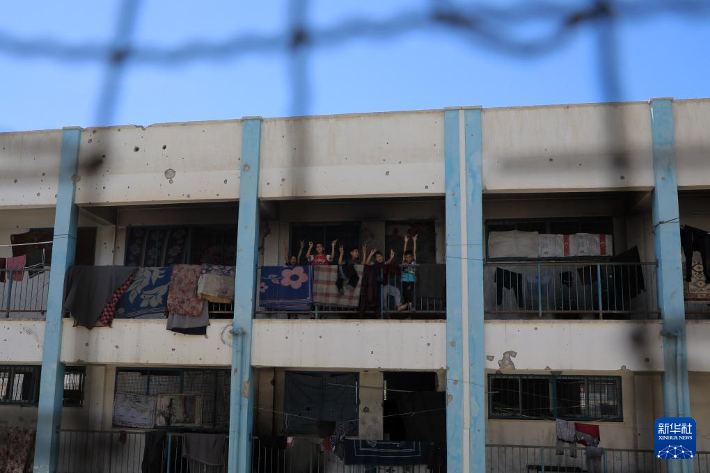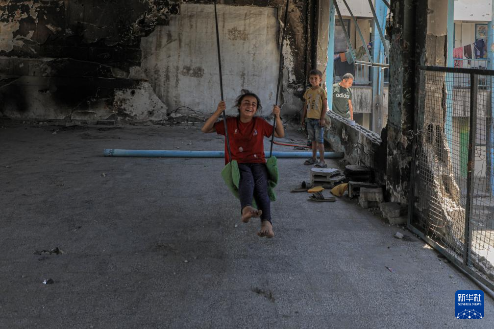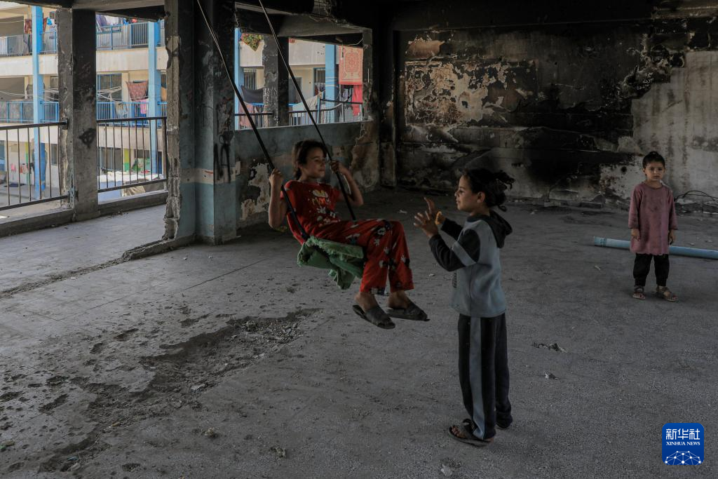 5月31日,儿童在加沙地带南部城市汗尤尼斯一处临时难民营里玩耍。