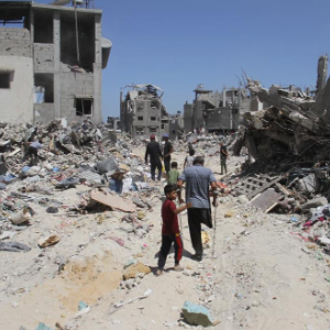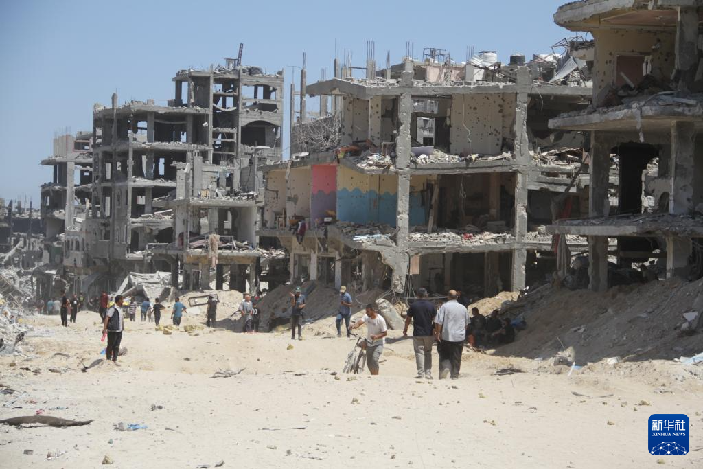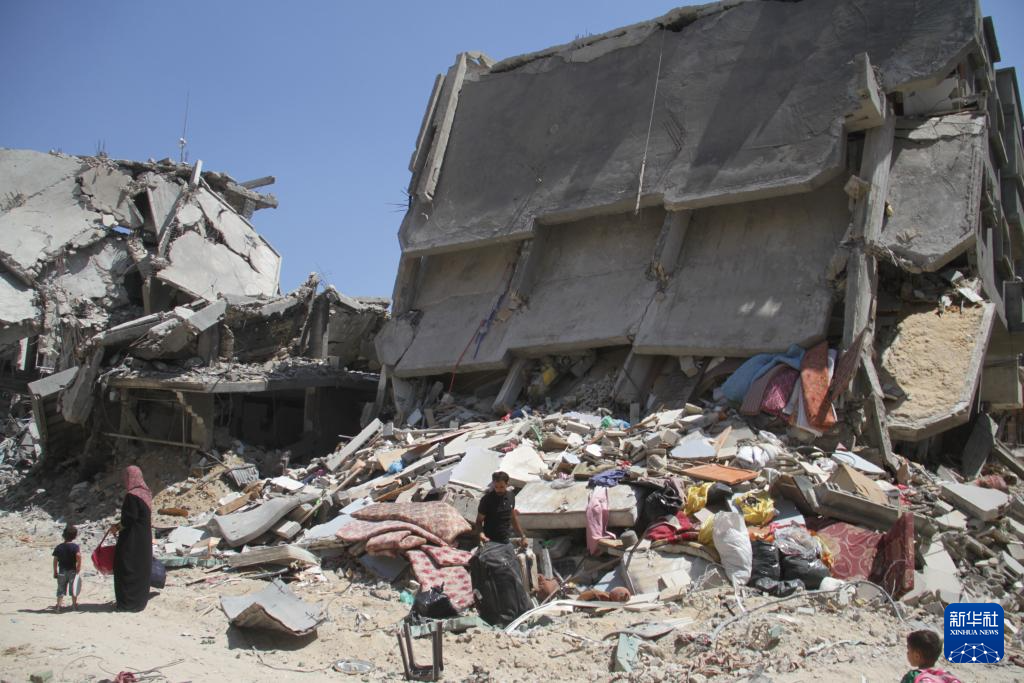 5月31日,在加沙地带北部杰巴利耶难民营,人们查看建筑毁坏状况。