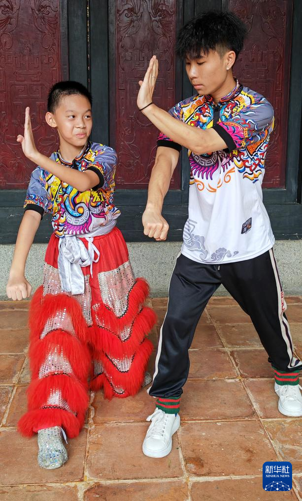 6月1日,新桥社区聘请的老师在指导孩子们练习舞狮。