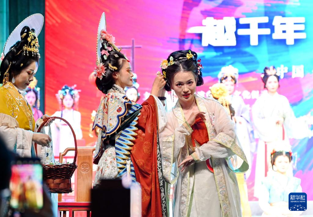 6月1日,演员在第七届海峡汉服文化节开幕式上展示簪花礼。