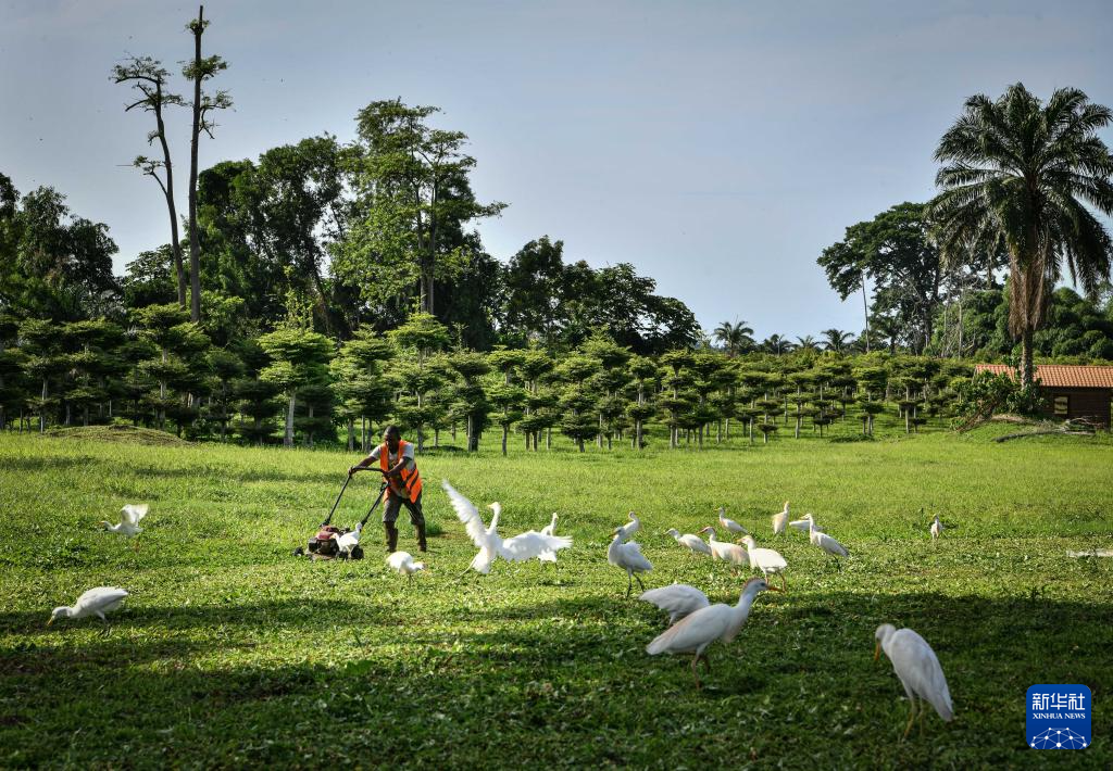 5月18日,在赤道几内亚首都马拉博,39岁的园丁沃约维诺·奥比昂在马拉博国家公园除草。沃约维诺2015年进入中国路桥任职,目前带领一支园丁小队负责公园的维护养护工作。