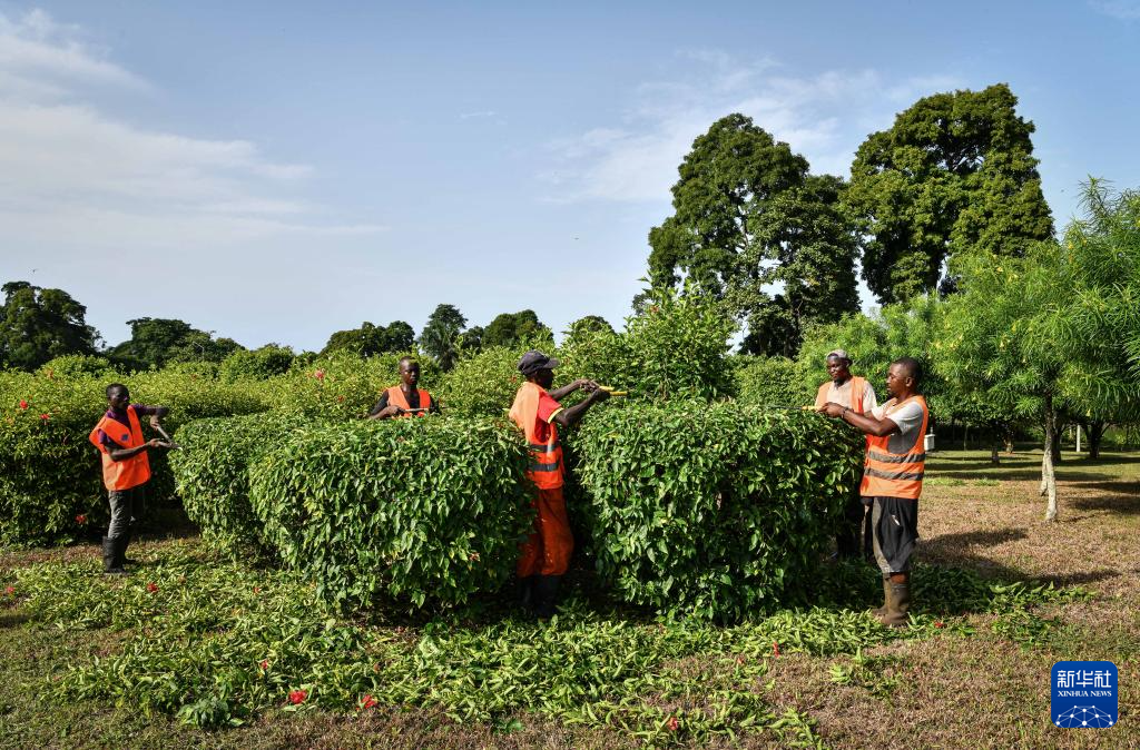 5月18日,在赤道几内亚首都马拉博,39岁的园丁沃约维诺·奥比昂(右一)和同事在马拉博国家公园修剪植物。沃约维诺2015年进入中国路桥任职,目前带领一支园丁小队负责公园的维护养护工作。