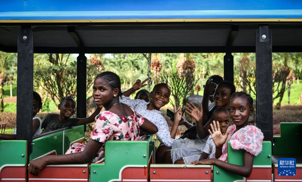 5月19日,在赤道几内亚首都马拉博,人们在马拉博国家公园里乘坐观光小火车。