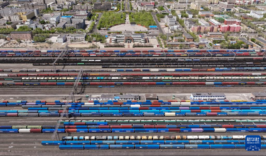 在新疆阿拉山口站宽准轨编组场,出入境中欧班列集结等待出发(5月25日摄,无人机照片)。