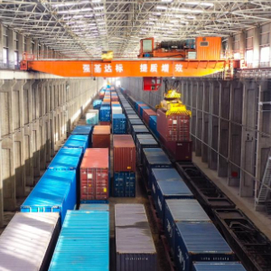 在新疆阿拉山口铁路口岸换装库内,桥吊在进行班列换装作业(5月25日摄)。