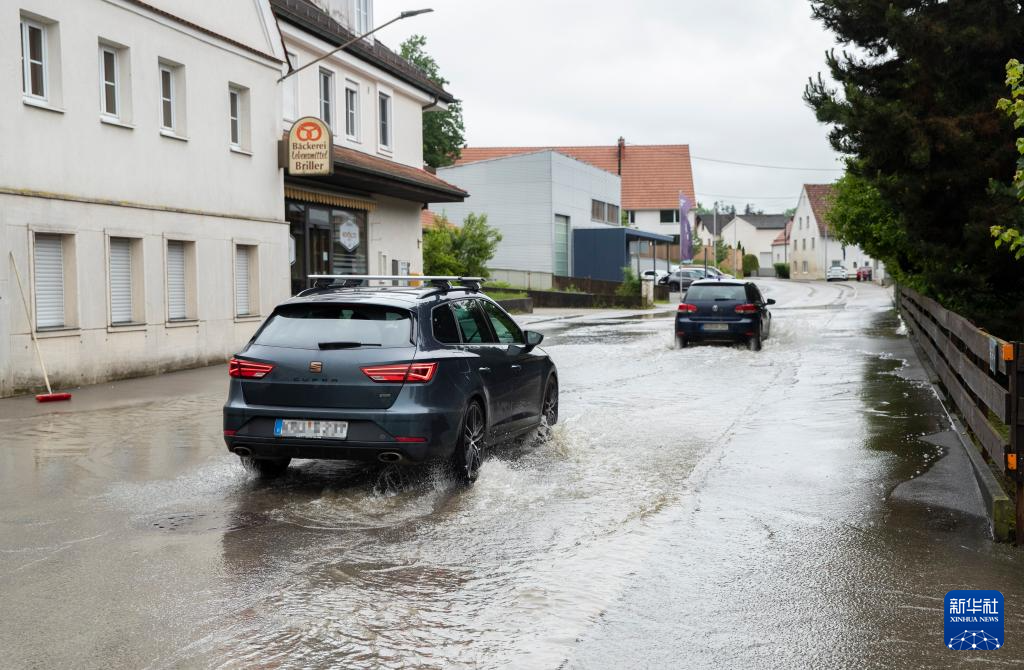 6月2日,在德国巴伐利亚州巴本豪森,车辆从洪水漫延的街道上驶过。