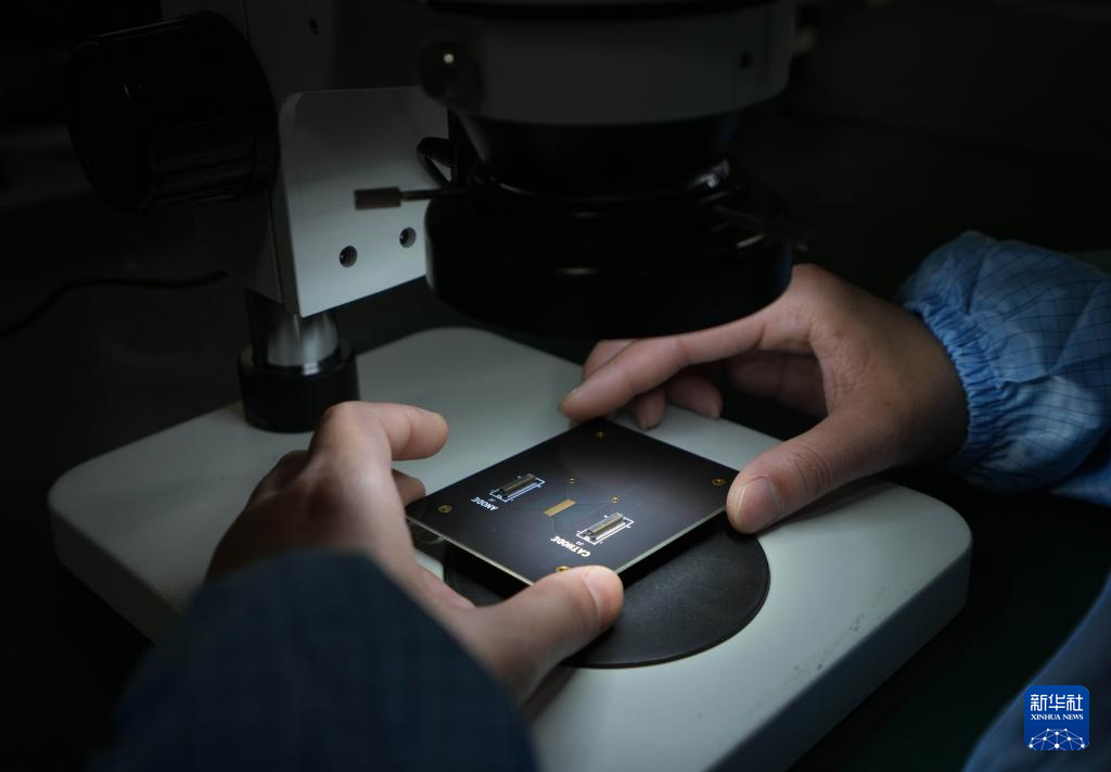 6月2日,工作人员在苏州光电技术研究院的封装测试公共服务平台车间内检测一块激光雷达芯片。