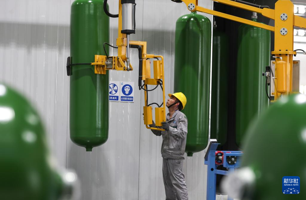 5月31日,一名工作人员在江苏国富氢能技术装备股份有限公司的储氢设备生产车间内作业。