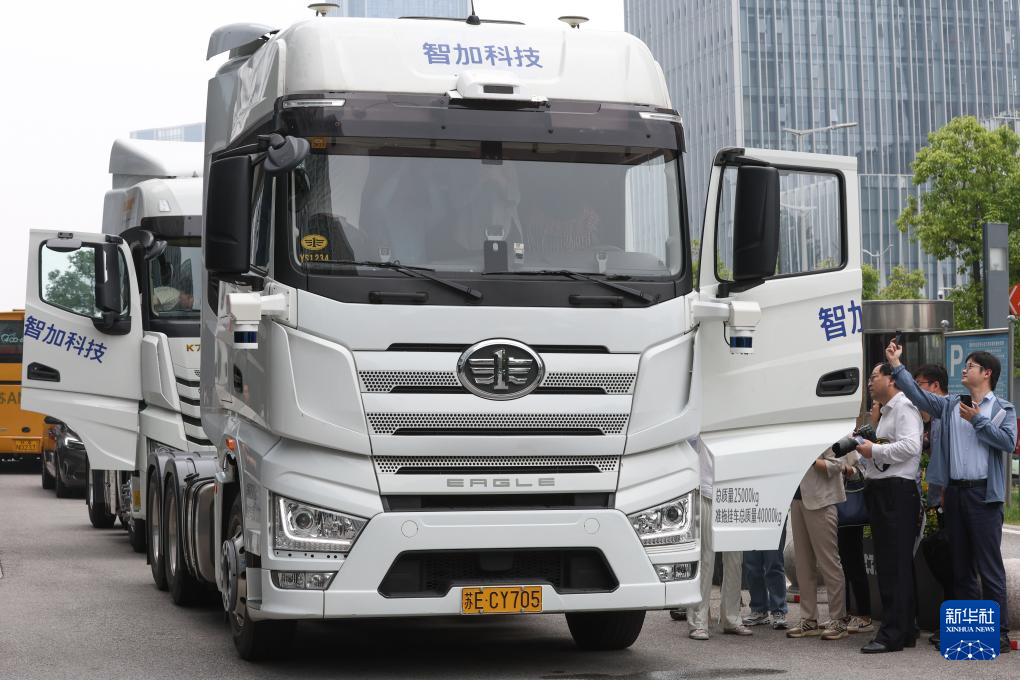 6月1日,人们在参观两辆由苏州智加科技有限公司与车企共同开发的智能驾驶重型卡车。