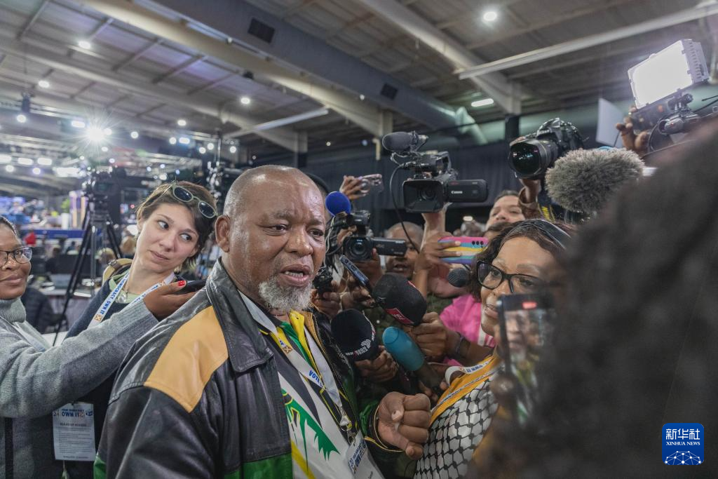 6月1日,在南非米德兰的大选计票中心,非国大全国主席格韦德·曼塔谢与记者交谈。