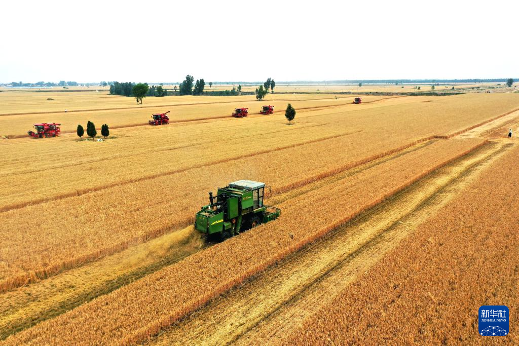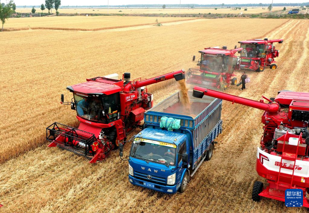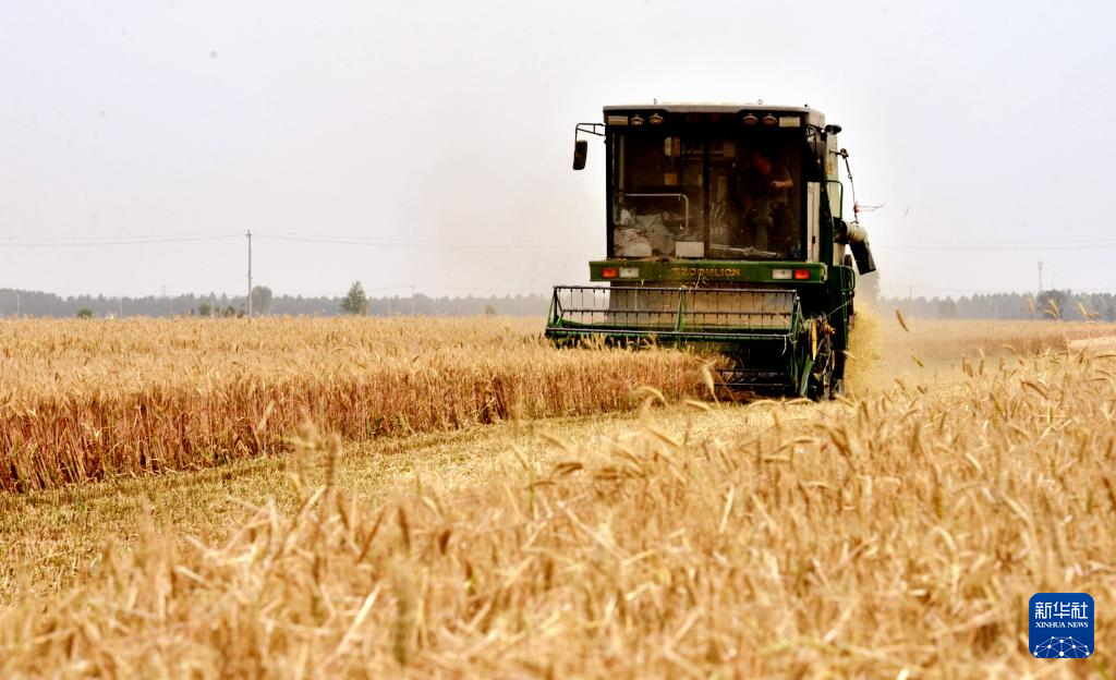 6月4日,在河北省邢台市南和区胡佃村,农机手驾驶收割机开展小麦收割作业。