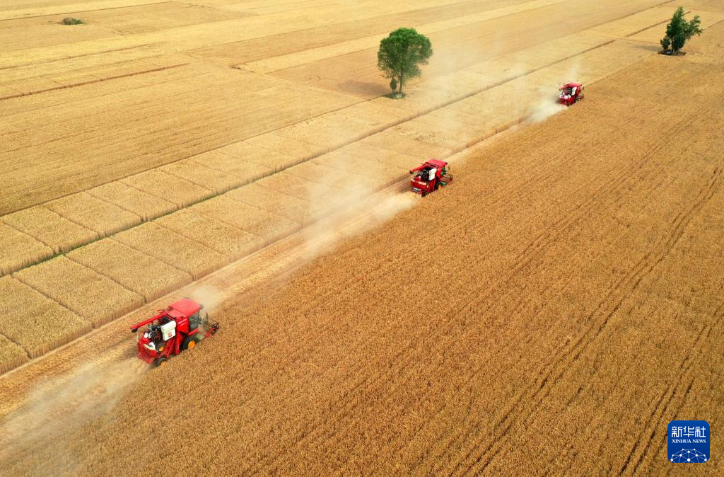 6月4日,在河北省邢台市南和区胡佃村,农机手驾驶收割机开展小麦收割作业(无人机照片)。
